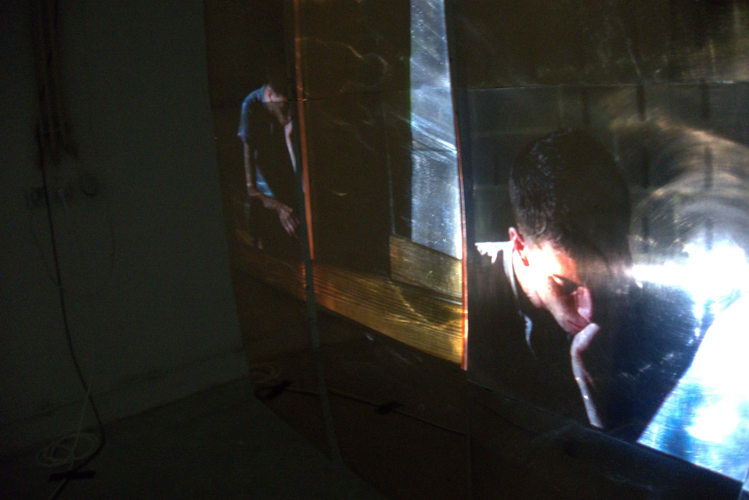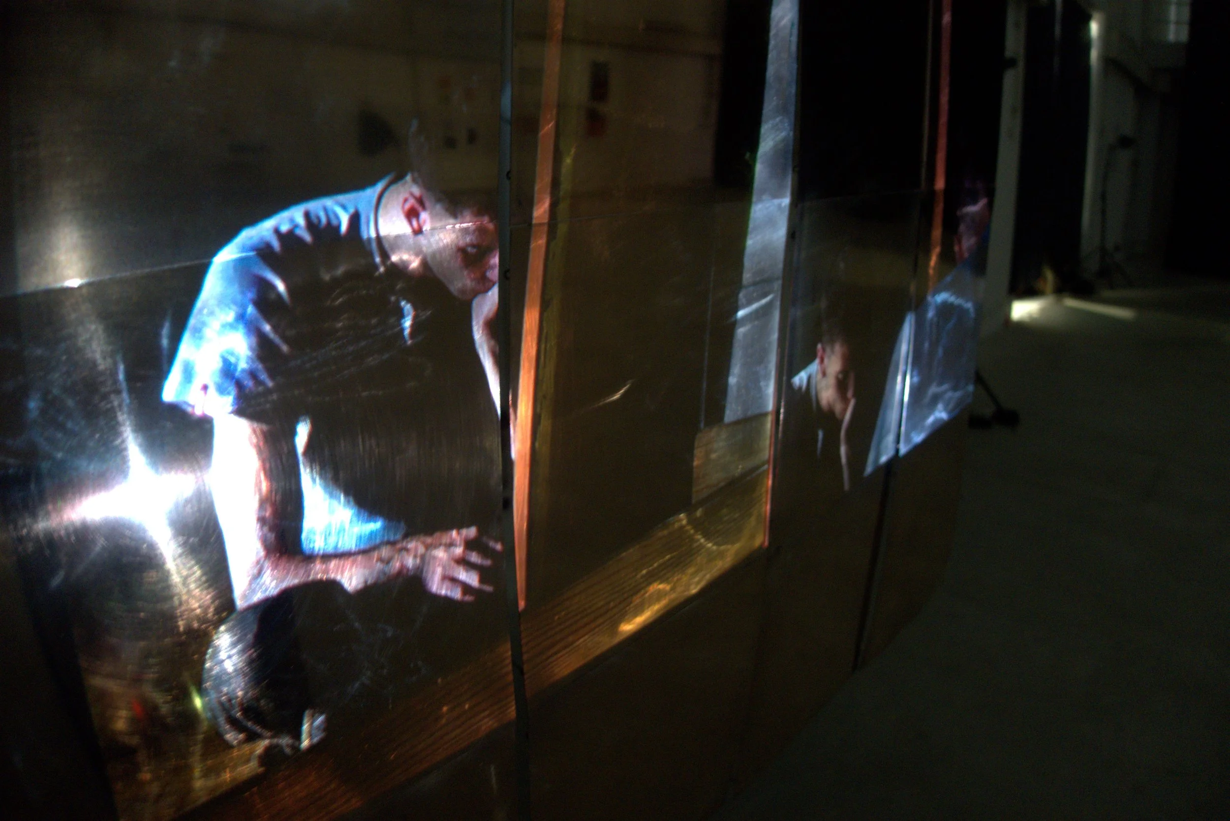 The video is projected directly onto the bronze plates, creating the illusion of an ethereal being trapped within the material. It depicts a figure seated, mesmerized by their own reflection in a mirror. The loop begins in near stillness, gradually unfolding into a series of movements that increase in complexity, continuously introducing new elements. While these motions seem to build upon one another, they are systematically disrupted, becoming fragmented and disjointed, until they dissolve into mere echoes of their former selves.